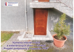 V rámci projektu boli vymenené pôvodné drevené dvere. Išlo o výmenu dvoch interiérových a dvoch exteriérových dverí, ktoré boli zničené a netesnili. Nové dvere sú zateplené a zatesnené a tak spĺňajú aj izolačné vlastnosti. Všetky dvere boli namontované s drevenou obložkou. Dvere sú z masívu a v obojstrannej farbe. Výmena dverí bola podporená dotáciou z PSK vo výške 2000,- eur.